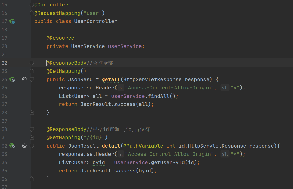 对应的两个控制器类:(查询全部用户信息、根据用户id查询对应信息)